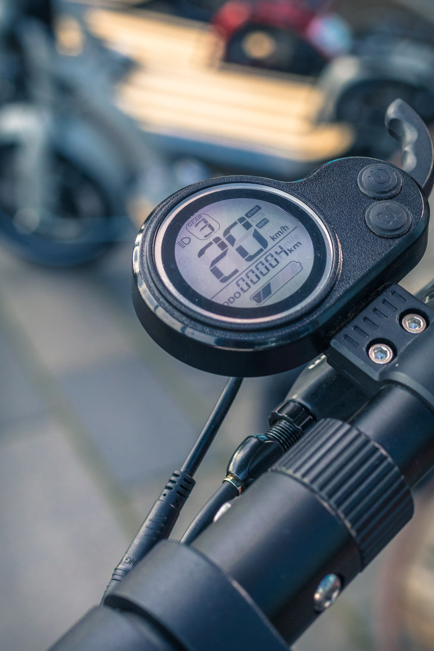 Der Evectro E-Kick-Scooter verfügt über helle Front- und Rückleuchten. Das Vorderlicht wurde für eine weitreichende Sicht oben am Lenker platziert. Das Rücklicht sitzt am hinteren Schutzblech. Über einen bequemen Zeigefinger-Gasgriff lässt sich der E-Roller beschleunigen, es lassen sich aber auch Fahrstufen einstellen. Ein digitales Display zeigt dir die wichtigsten Parameter an. Mit einem ausklappbaren Seitenständer kannst du deinen Kick-Scooter parken. Ein Sicherheitsschloss ist nicht vorhanden. Möchtet Ihr dennoch ein Schloss für euren e-Scooter haben, haben wir hier die besten e-Scooter Schlösser aufgelistet!