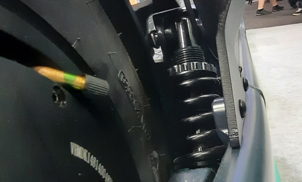 Auf dem Foto seht Ihr das rechte Federbein, das zwischen Rahmen und Hinterradschwinge aufgehängt ist. Mit dem Drehrad über der Feder könnt Ihr bei Bedarf nachjustieren. Das ist auf jeden Fall ein Vorteil, wenn Ihr mehr Gewicht auf die Waage bringt. Bei anderen E Scootern mit Vollfederung schlägt da bei höherer Traglast die Federung schon mal an. Beim Egret nicht, da dieser eben nicht nur vom Rahmen sondern auch in Sachen Federung bis 150 Kg trägt.