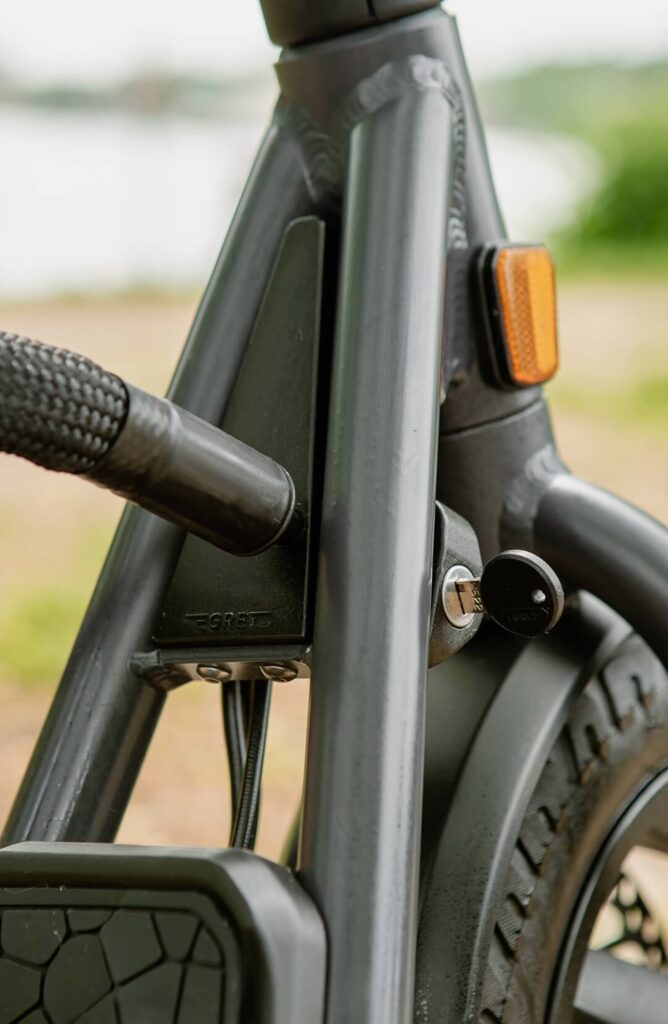 Der einzigartige Verschlussmechanismus, der speziell für Egret entwickelt wurde, ermöglicht es, den Bolzen direkt in das (teilweise) integrierte Rahmenschloss des E Scooter einzusetzen. Nachdem du das flexible Seil um einen Laternenpfahl oder einen Fahrradständer gewickelt hast, kannst du den Schlüssel des Rahmenschlosses entfernen, und schon ist dein Egret E-Scooter sicher geparkt.