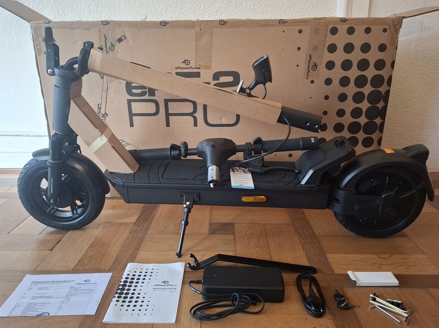 Der ePowerfun ePF_2 Pro lässt sich in nur 15 Minúten aufbauen, auch wenn man ungeübt ist darin. Der E-Scooter wird fast vollständig vormontiert geliefert. Im Lieferumfang, wie oben im Bild zu sehen ist haben wir die ABE, die Ihr für die Versicherung braucht, die Bedienungsanleitung, das Ladegerät mitsamt Ladekabel, die Schlüssel für den Wechselakku, ein paar Schräubchen und das Werkzeug. Man muss nur die Lenkerstange hochklappen, bis sie einrastet und den Lenker ausstecken. Dieser wird seitlich mit den Schrauben fixiert und schon seid Ihr fertig.