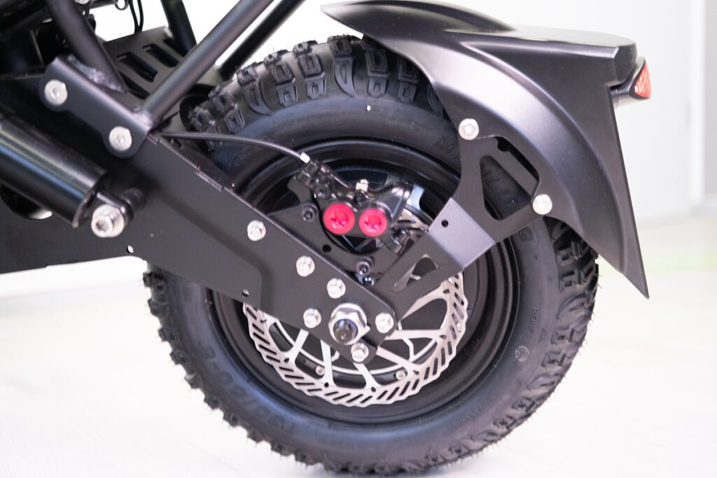 Besonders beeindruckt hat uns die Motorleistung des E Scooter mit Allradantrieb. Der verbaute Nabenmotor liefert nicht nur eine kraftvolle Beschleunigung, sondern entfaltet bei Bedarf auch eine Spitzenleistung von bis zu 3000 Watt. Das macht sich vor allem beim Anfahren an Steigungen oder beim Überholen bemerkbar. Der E-Scooter zieht sauber und ohne spürbare Verzögerung durch.
