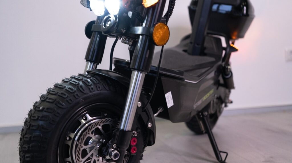 Beim Kurvenfahren zeigt sich ebenfalls ein klarer Vorteil: Der Scooter bleibt auch bei höherem Tempo gut kontrollierbar, kein Wegziehen des Vorderrads, kein nervöses Heck. Die gleichmäßige Kraftverteilung sorgt für ein ruhiges, berechenbares Fahrverhalten, selbst bei engen Radien oder schnellen Richtungswechseln. Auf Waldwegen und unbefestigten Strecken zeigte sich der Scooter ebenfalls von seiner besten Seite. Er ist ppurtreu, kraftvoll und ohne Traktionsverlust. Testergebnis Allradantrieb: 1 (Sehr Gut)