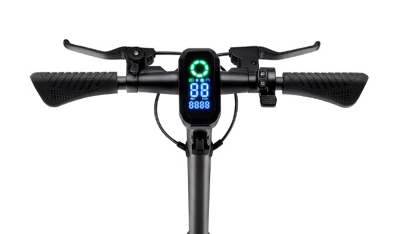 Die Armaturen sind sehr hochwertig und aus gutem Material. Die Lenkergriffe sind ergonomisch geformt. Nur ein Detail, aber sehr schonmal sehr cool. Über die beiden Bremsgriffe lässt sich die vordere Trommelbremse und die hintere elektronische Bremse bedienen. Der Tacho ist im Vergleich zu anderen E Scootern in dieser Preisklasse höherwertiger. Alle Leistungsdaten können übersichtlich abgelesen werden, auch auf unserer ruckeligen Testfahrt. Natürlich können die Leistungsdaten auch via Bluetooth bzw. App auf euere Handy übertragen werden: Testurteil Tacho Display: Sehr gut.