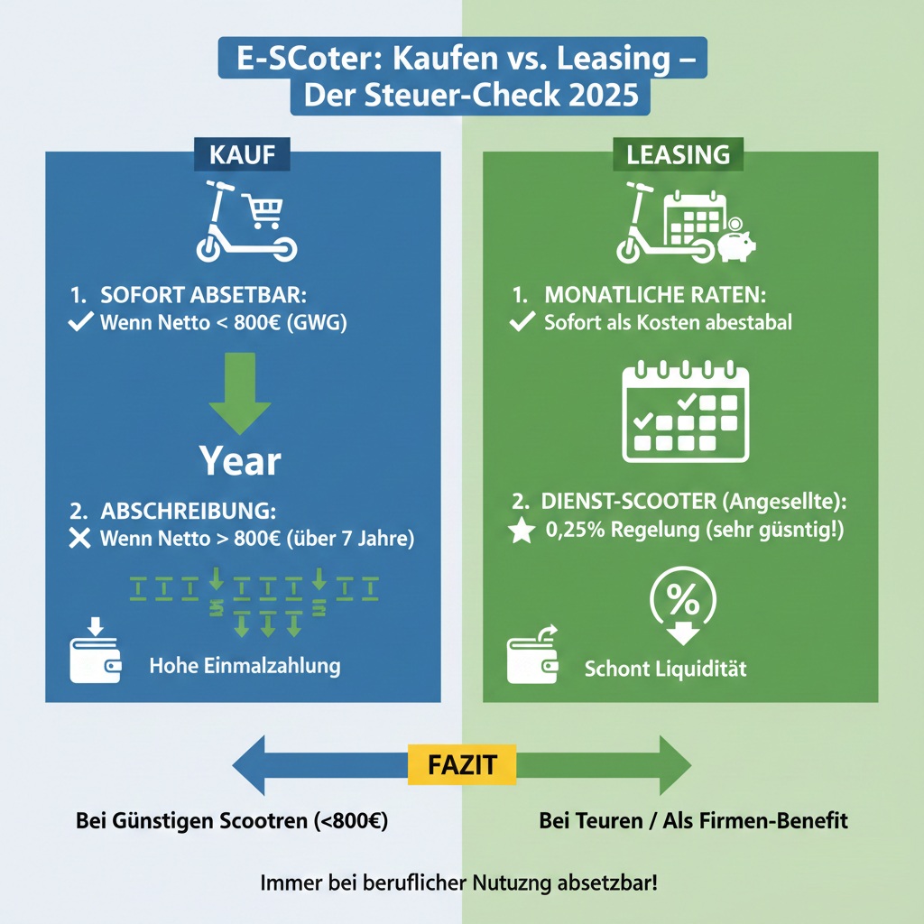 - Vorteil: Auch wenn der Scooter teuer ist, ziehst du die Kosten viel schneller ab als über die 7-jährige Abschreibung beim Kauf. Zudem schont es dein Erspartes (Liquidität).