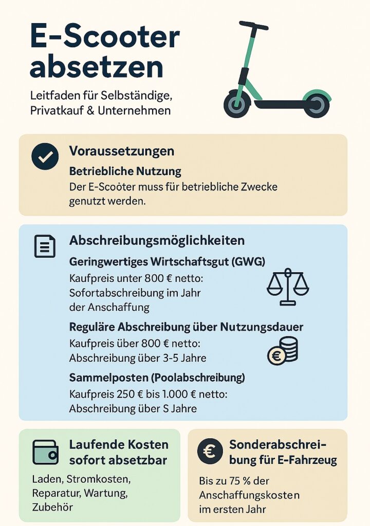 | Geringwertige Güter | Sofort absetzen | Wenn der Scooter netto weniger als 800 € (bzw. 952 € inkl. MwSt.) kostet, kann er oft im selben Jahr voll abgeschrieben werden. |